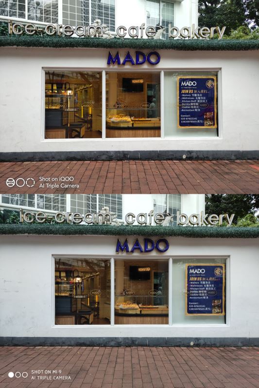 从街景的样张来看,小米9的照片确实相对要暗淡一些。iQOO的照片在保持自然的同时,色彩会更讨喜眼球,例如橱窗透出的光线、路面湿滑的地砖。