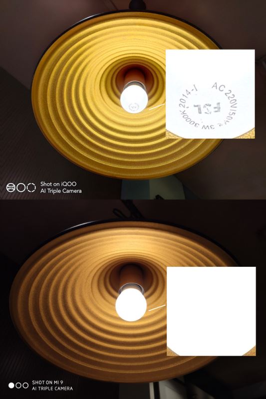 我们在这里也测试了一下逆光的性能,支持Super HDR技术的iQOO表现很是不错,灯泡上的标识很清晰地拍下来。相较之下,小米9的逆光成像还是得好好优化一下。