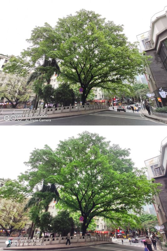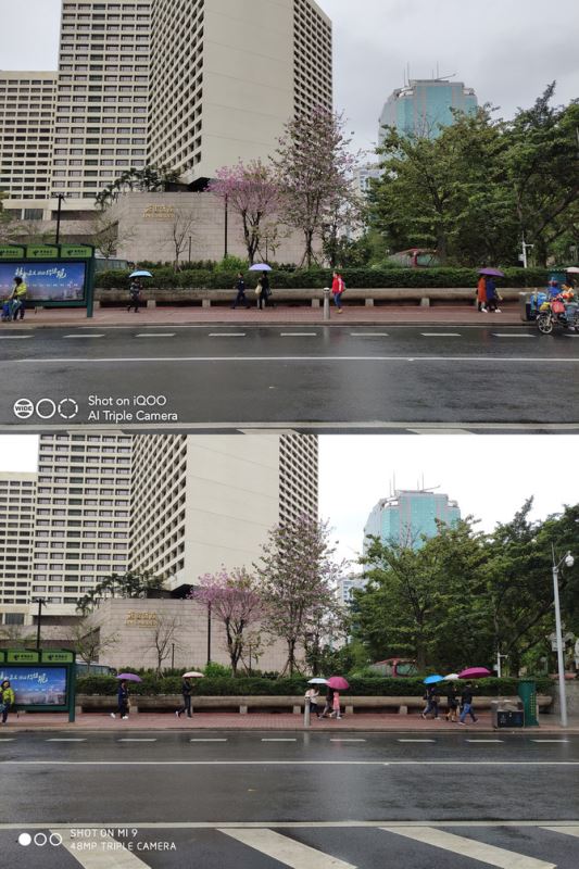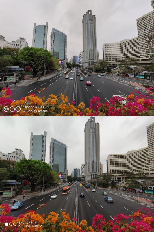 iQOO和小米9均支持超广角拍摄功能,前者最大拍摄角度为120°后者则为117°,并且默认支持畸变自动矫正。大家别小看这3°的差距,从最终成像来看,角度更广的iQOO样张场景更广阔更有气势。