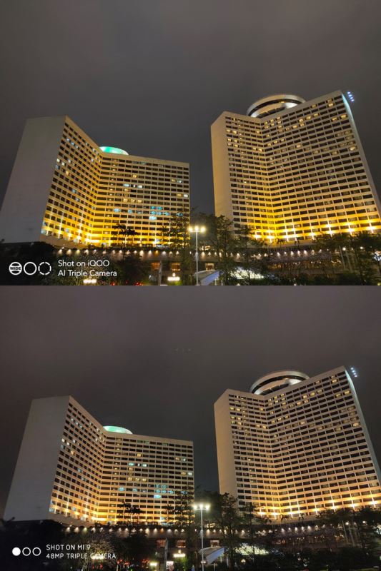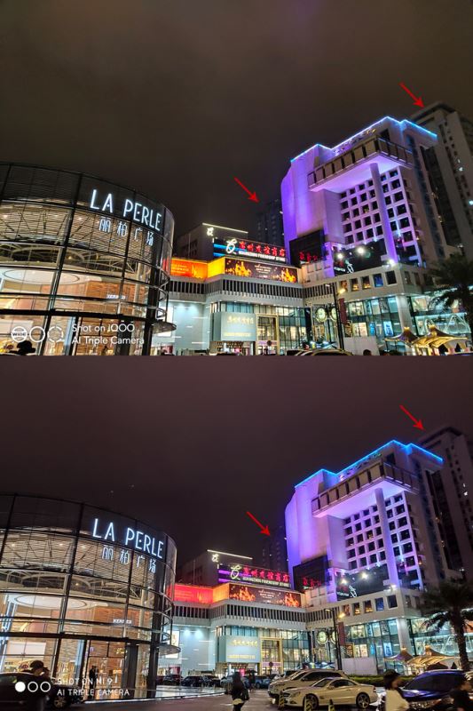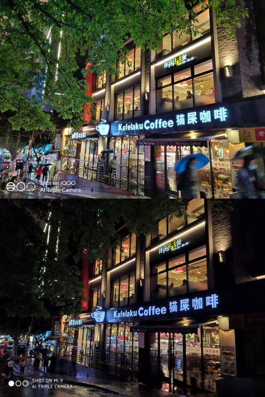 在开启超级夜景模式后,iQOO和小米9均默认1200万像素拍照。而超级夜景的优点在于,夜拍时通过多帧合成,拍出高光不过曝弱光不偏暗的超高动态范围照片。在第一个场景时,iQOO的表现不错,基本满足了超级夜景的平均水准。小米9的暗部似乎没有太好地识别,为此我们又换了一个场景。
