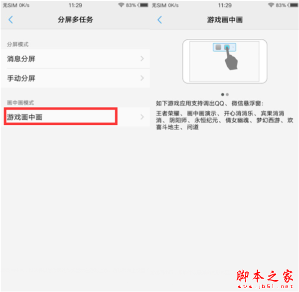 2、进入【分屏多任务】点击【游戏画中画】设置进入,即可在【游戏画中画】界面查看到支持的程序及操作方法。