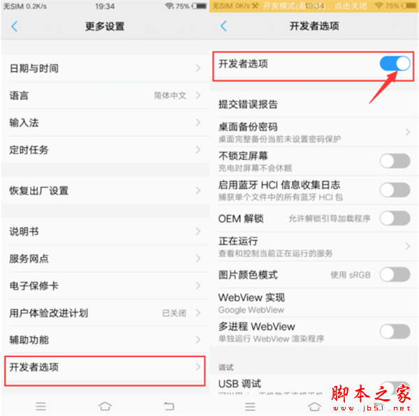 点击返回键返回到“更多设置”界面,然后选择“开发者选项”,开启“开发者选项”开关,开启后状态栏会变为橙色。
