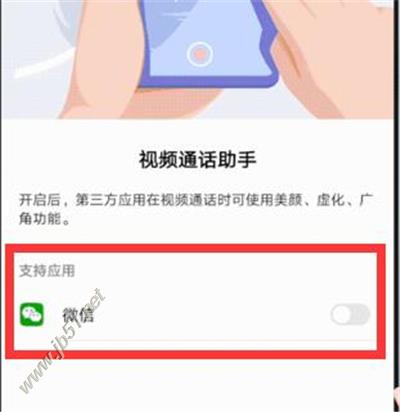 7、最后我们只要点击打开需要使用视频通话助手的应用开关,即可在使用该应用进行视频通话时,使用系统相机的美颜、虚化和超广角功能,即使应用没有视频美颜功能也不怕,比如说微信。