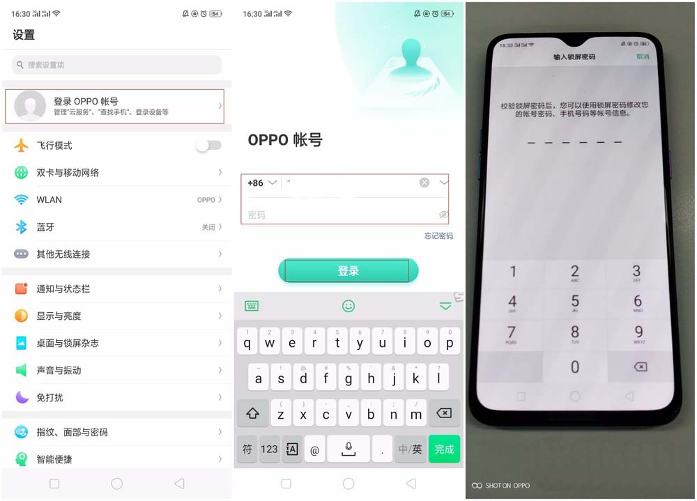 1、通过【设置】—【登录OPPO帐号】输入帐号+密码,会出现相应输入锁屏密码的界面(校验锁屏密码后,您可以使用锁屏密码修改您的帐号密码、手机号码等帐号信息)。