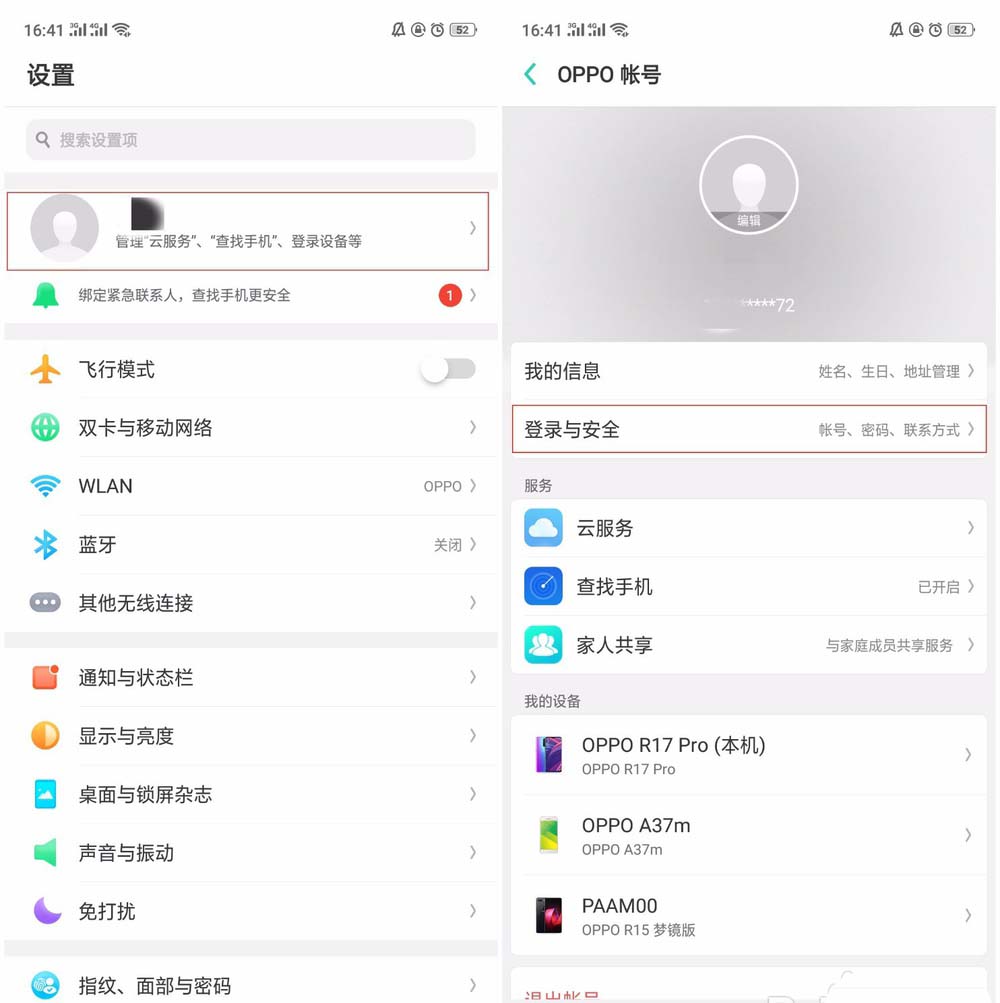 3、如果长期登录忘记了OPPO帐号的密码,可以通过【设置】—【顶部OPPO帐号头像】—【登录与安全】进入。
