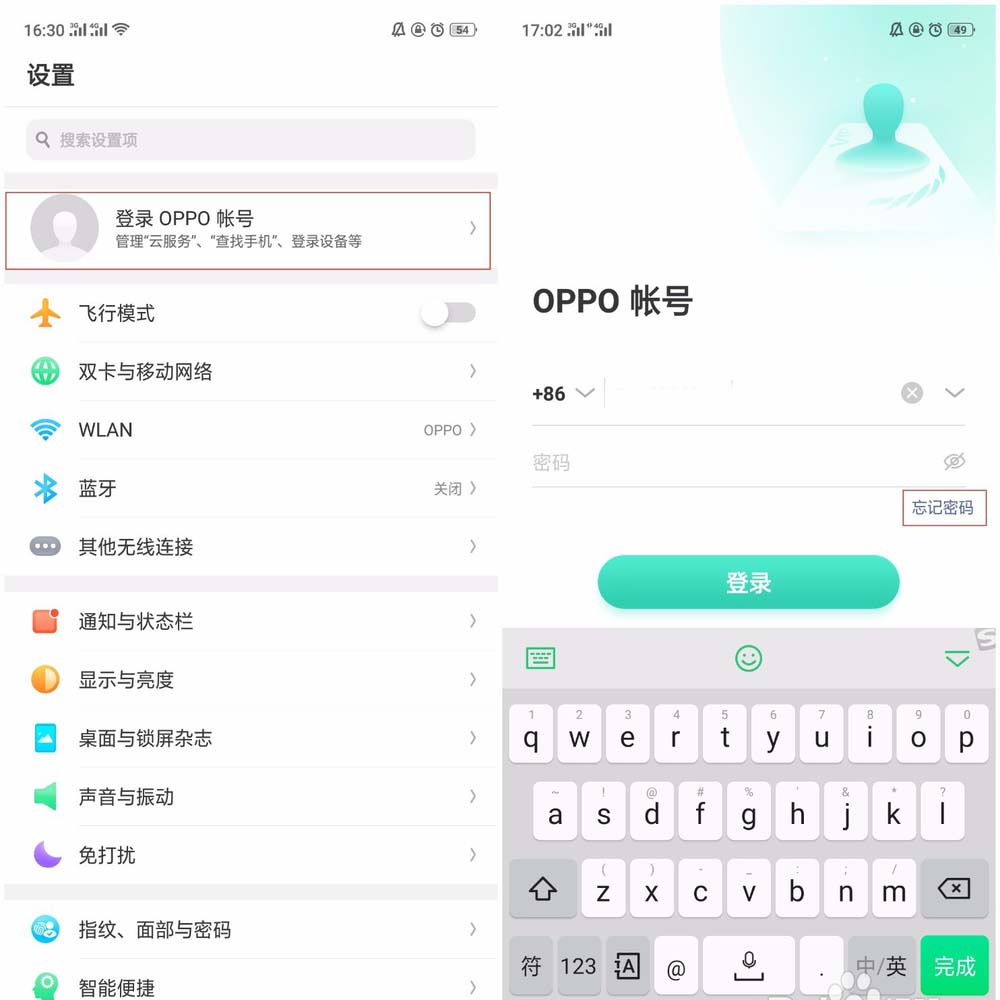 1、通过【设置】—【顶部OPPO帐号头像】,在登录帐号的界面点击【忘记密码】。