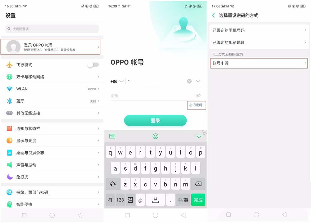 4、如果绑定的信息无法验证,可以通过申诉找回密码,申诉路径:【设置】—【顶部OPPO帐号头像】—【忘记密码】—【帐号申诉】。