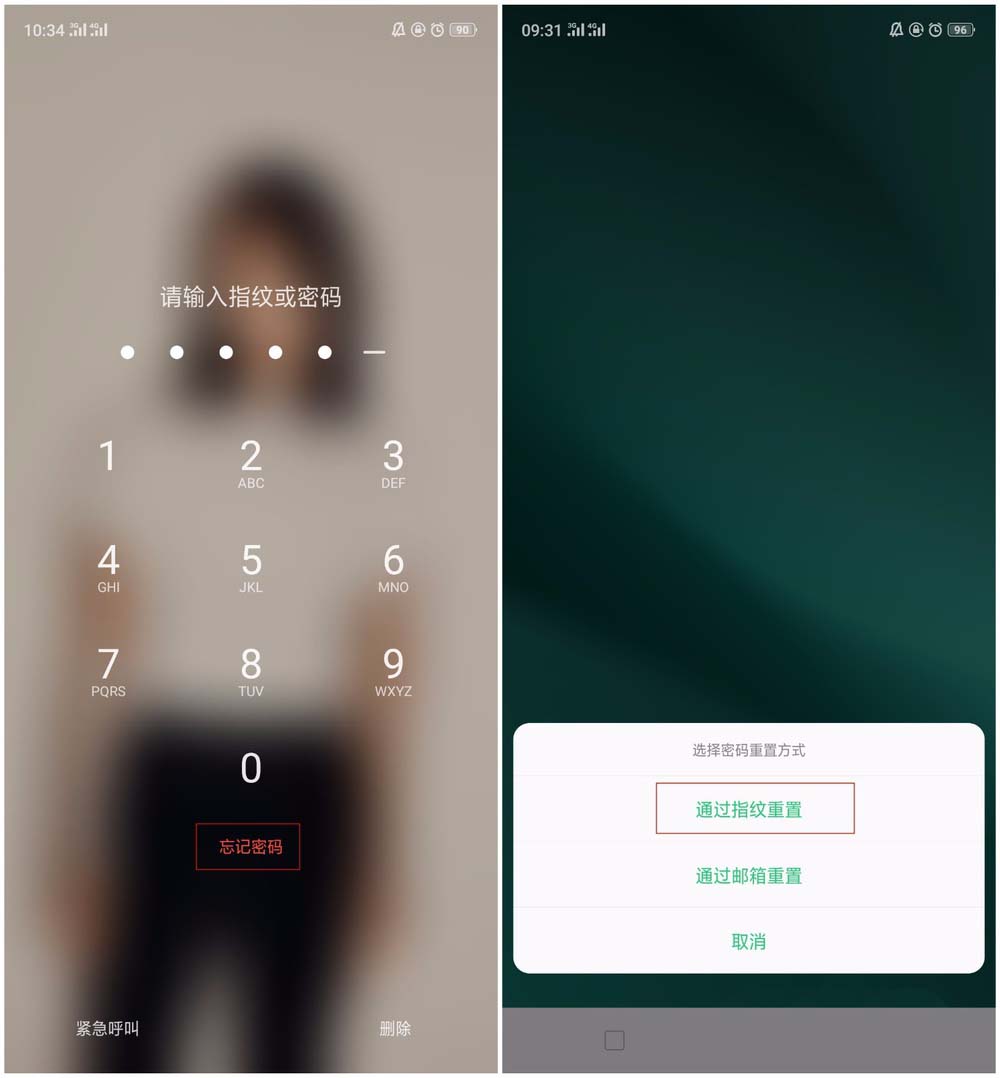 1、如果之前有设置指纹解锁,可以先在解锁界面输入错误密码,会看到【忘记密码】出现,点击进入后选择【通过指纹重置】。