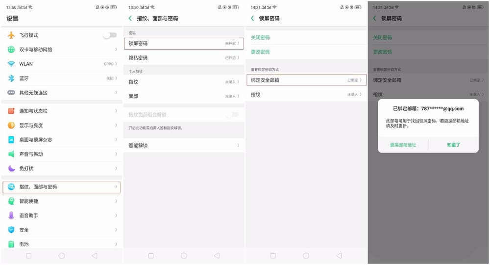 1、如果之前有通过【设置】—【指纹、面部与密码】—【锁屏密码】—【绑定安全邮箱】设置了绑定邮箱。
