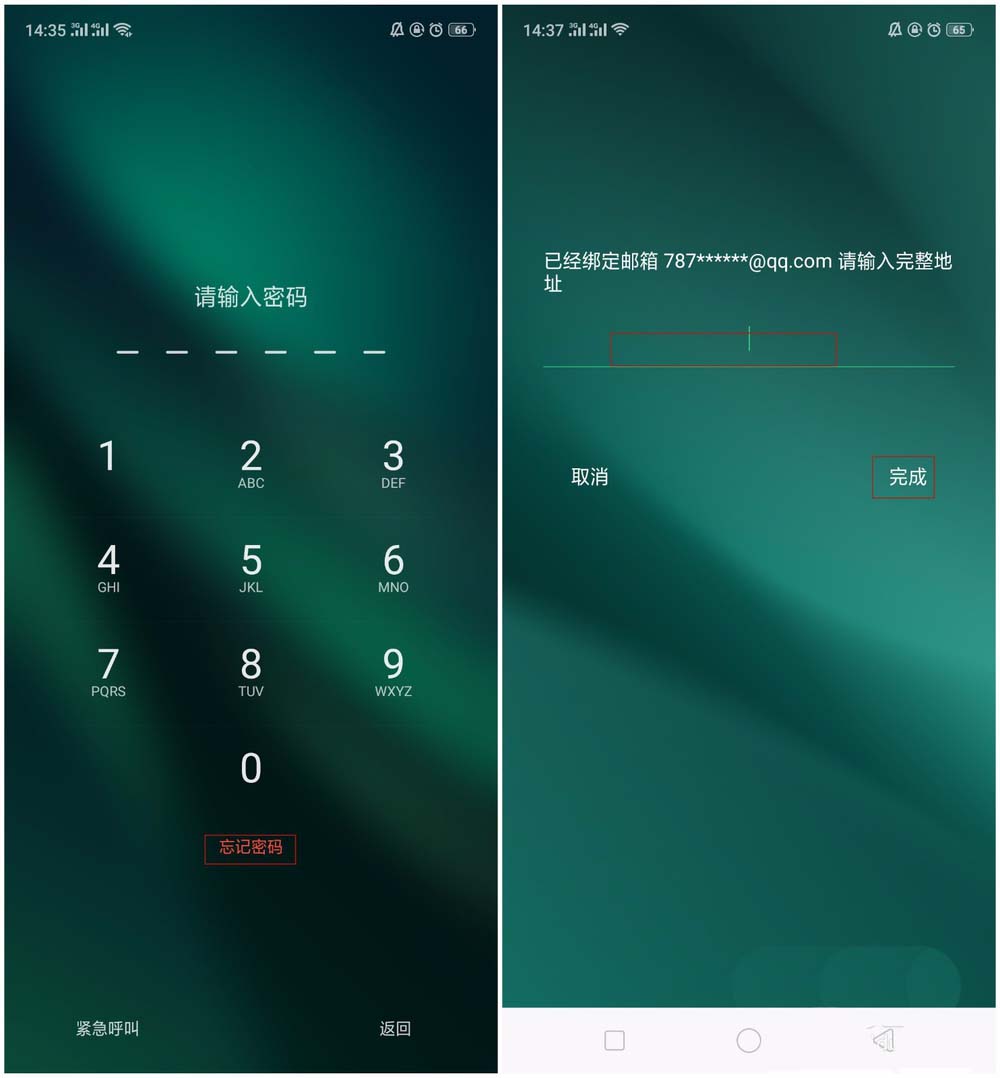 3、输入完整邮箱后会发送相应的验证码到邮箱,通过邮箱查看验证码后进行相应填写,点击【完成】—会进入设置锁屏密码的界面,就可以重新设置锁屏密码了。
