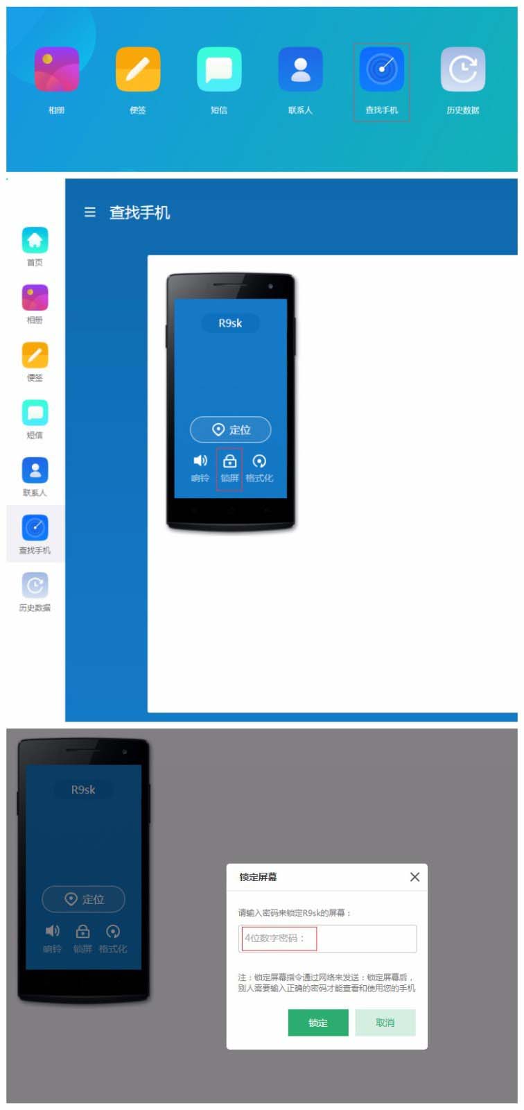 2、进入相应的界面后点击【查找手机】—【锁屏】—即可根据提示来重新设置锁屏密码咯,再解锁手机输入刚刚设置的密码就好了。
