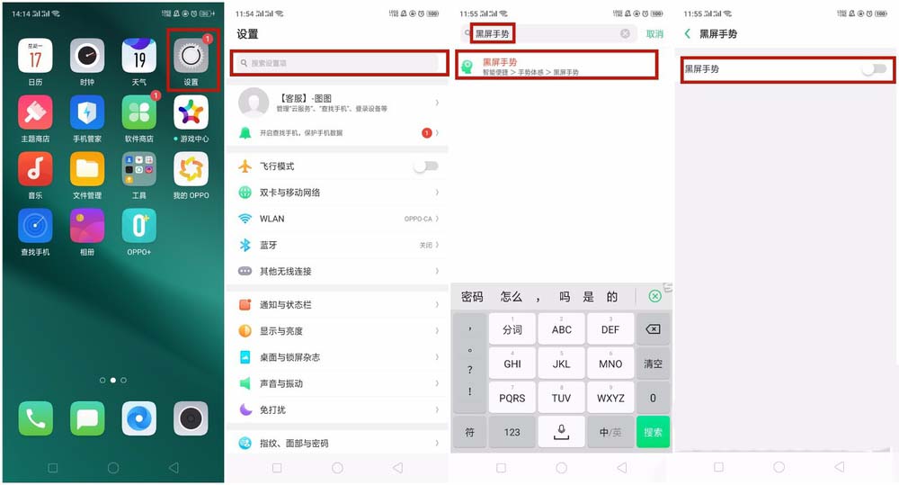 1、通过桌面【设置】—点击搜索栏输入想查找的功能,这里以【黑屏手势】为例,输入【黑屏手势】,点击相应出现的内容进入,即可进入相应设置界面。
