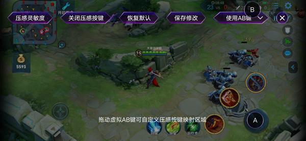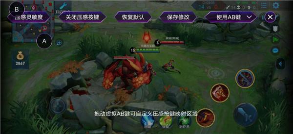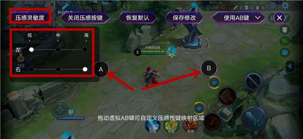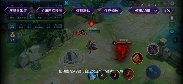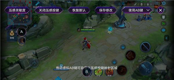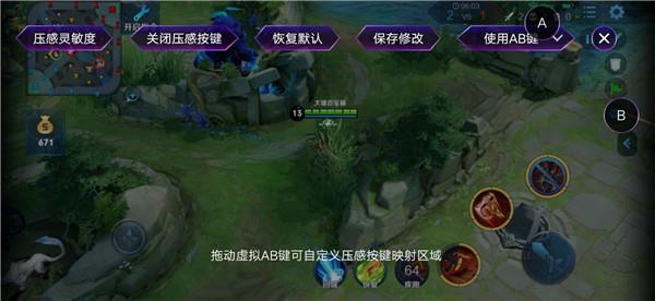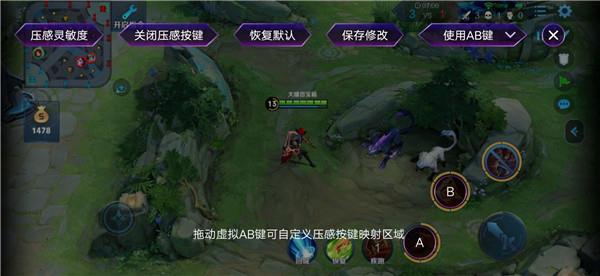 4、然后您可以依次按住A、B压感按键,将其拖动到您想要映射的区域——经过小编设置,压感按键可以映射到除了方向按键之外的任意区域,当做任何按键使用。(A表示左边的压感按键,B表示右边的压感按键)