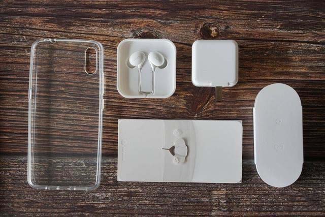 配件全家福,手机套、XE710耳机、充电头、说明书、卡针及充电线。