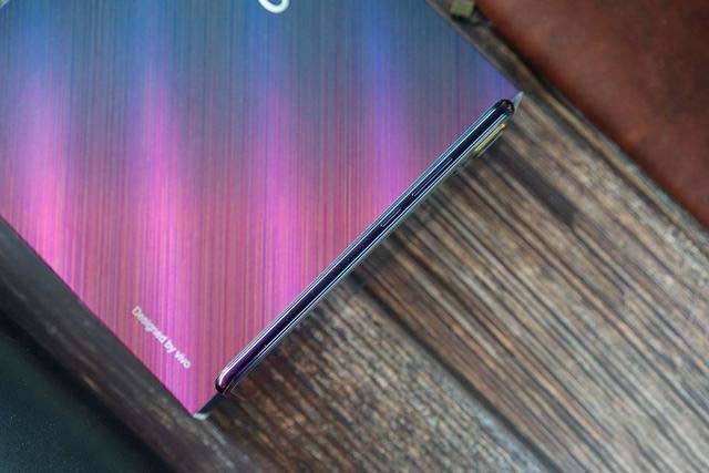 两侧边框变化不大,左侧依然是Jovi AI智慧键及SIM卡槽,右侧则是音量键及电源键。比较特别的是,为了跟背面有更加统一的视觉效果,边框处也是做了渐变色处理。