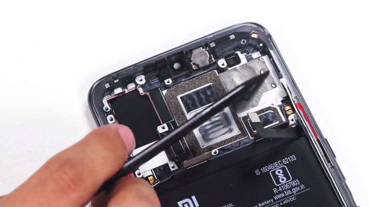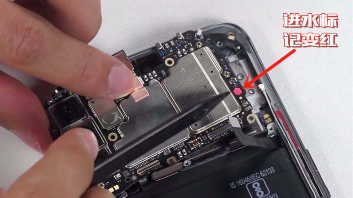 拆开手机后盖,基本各个部件都有明显的水剂。手机内部有一些指示片变为了红色,是小米工程师判断手机进水的“标记”。