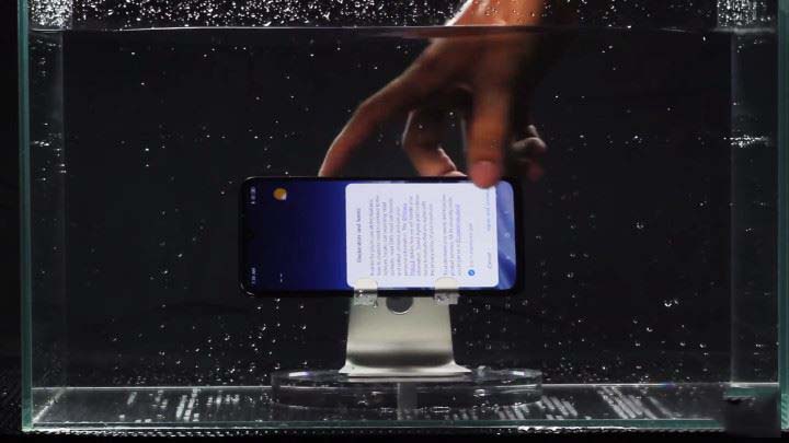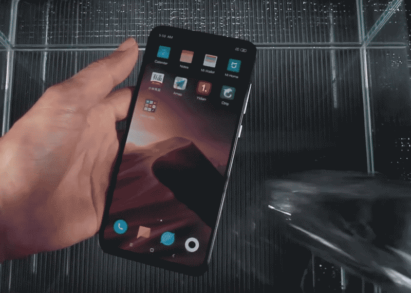 将小米9快速置入水中再迅速撩起,检查瞬间浸泡在水池中的小米9是否会进水。在来回淌水几次后,小米9的各项功能依旧正常。