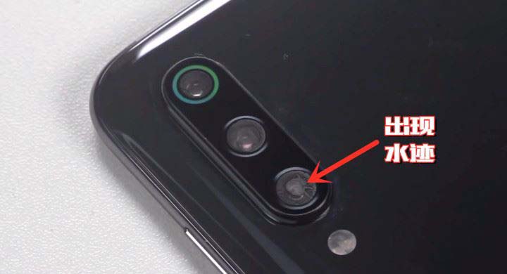 将进水后的小米9,进行拆机检查进水情况。从外观来看,最明显的是后置摄像头,摄像头的玻璃后盖已经有明显水气。