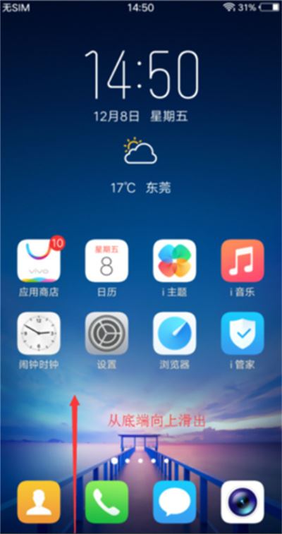 1.打开vivoy91手机,在手机桌面最底端往上划,之后会弹出一个菜单栏,下排的就是相当于手机的快捷菜单之类的。