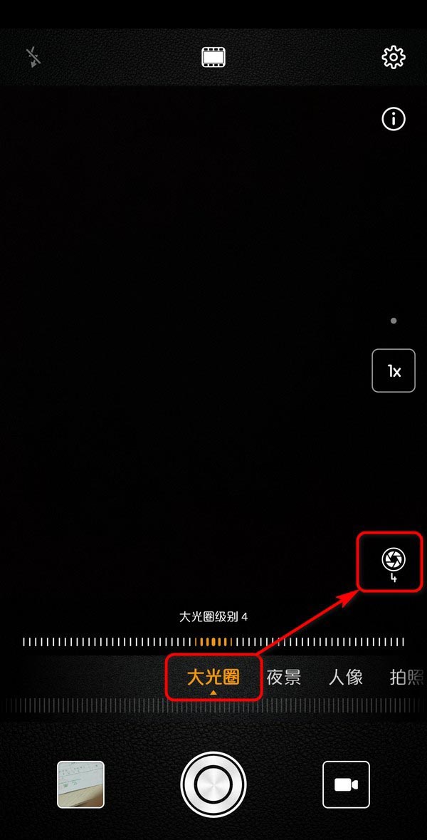 2、进入相机界面,在拍照模式的地方往右边滑动,选择大光圈。