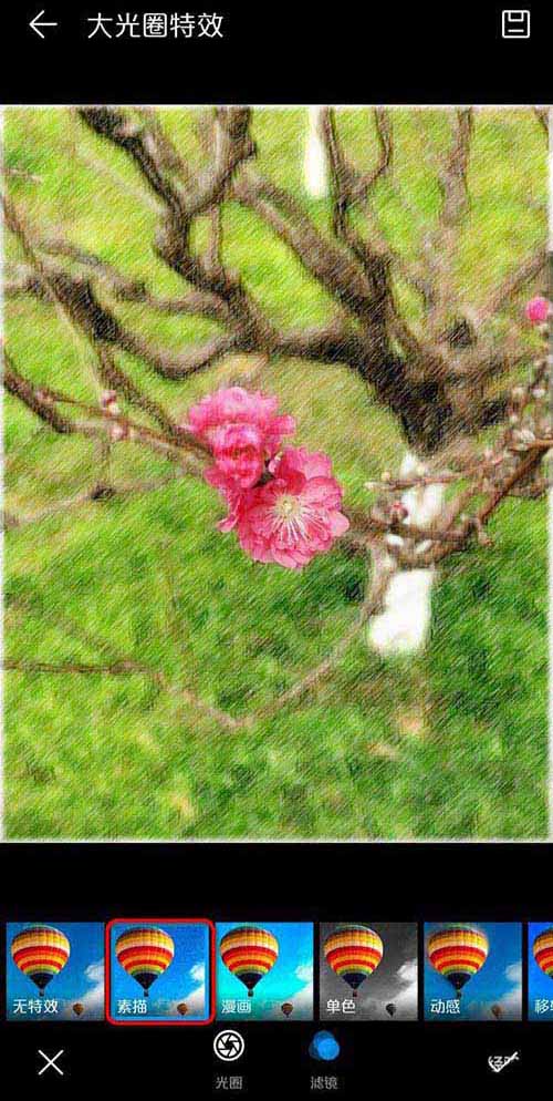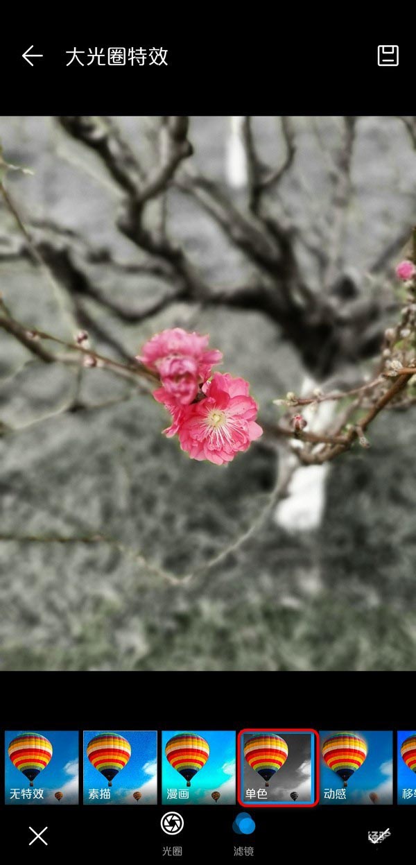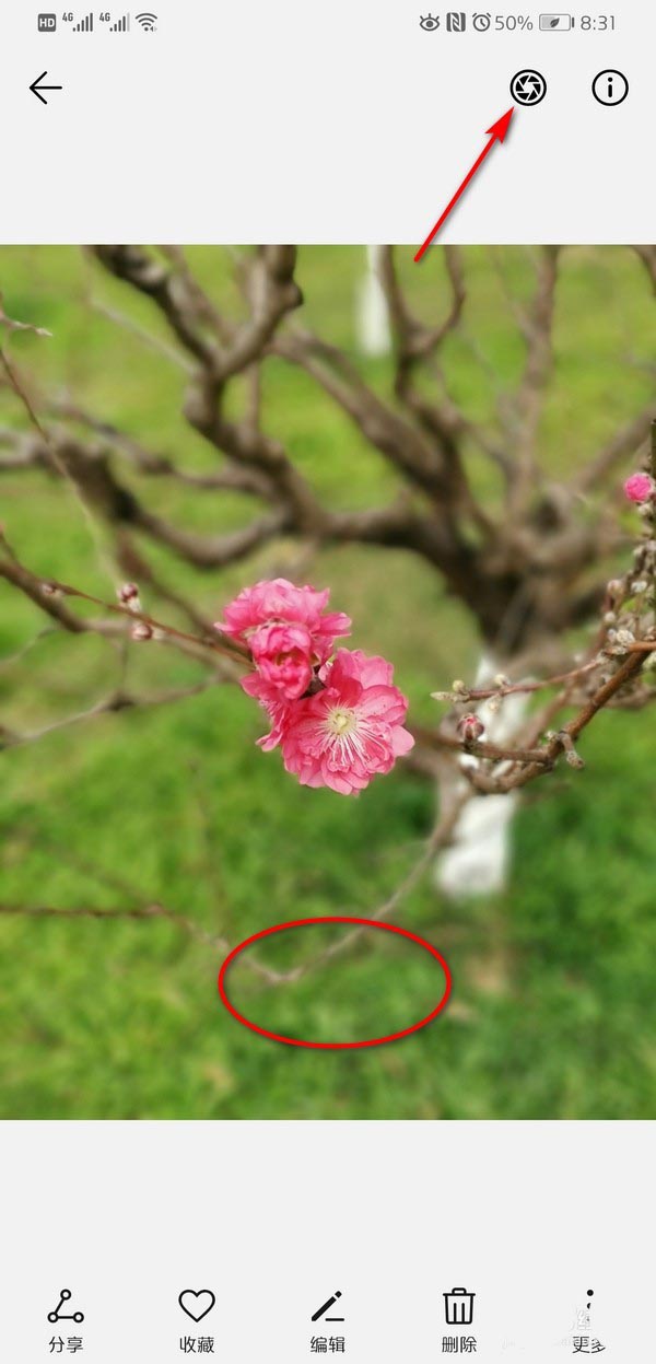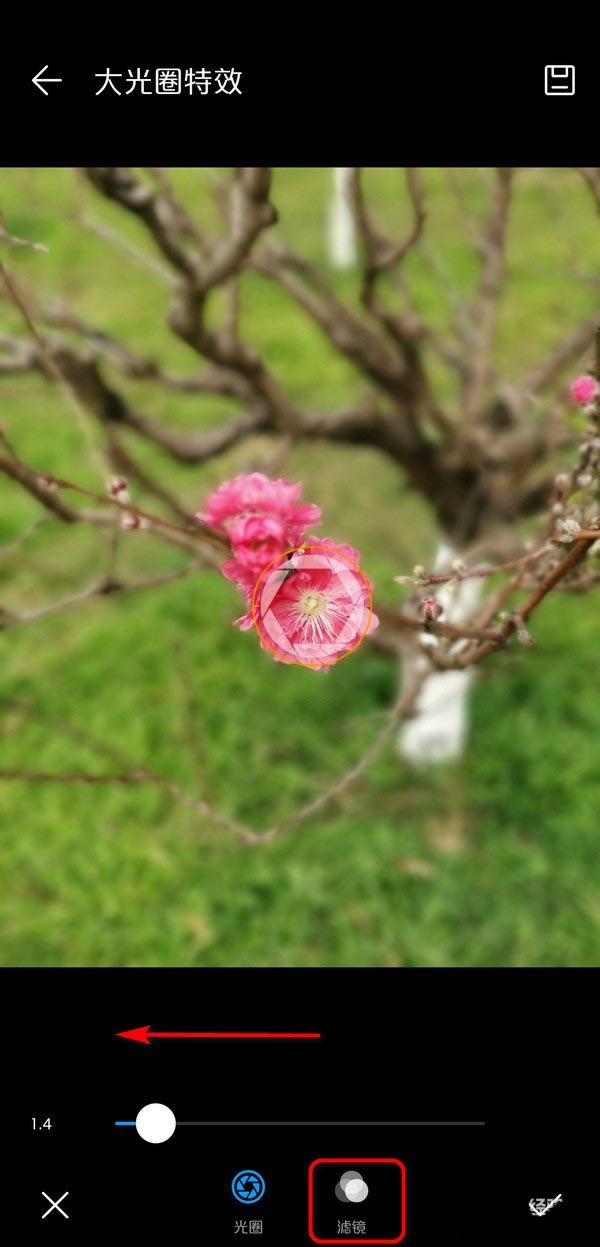 3、然后对着物体拍照,拍照的时候要点击一下物体主要的部分。拍出来的效果就是下面这张图,有没有看到桃花拍得很清晰,旁边的树枝绿叶都很模糊,这就是大光圈效果。点击照片右上角的光圈图标。