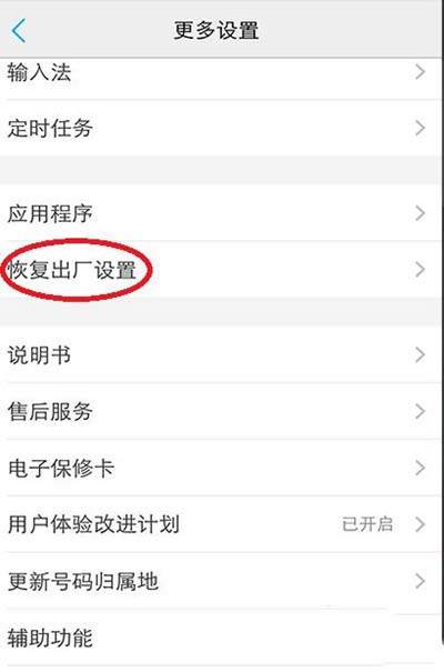 2、在更多设置,滑动页面,找到并点击【恢复出厂设置】,注意:以防万一重要资料丢失,一定要事先把手机备份资料,再点击“恢复出厂设置”