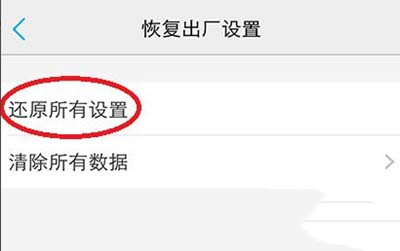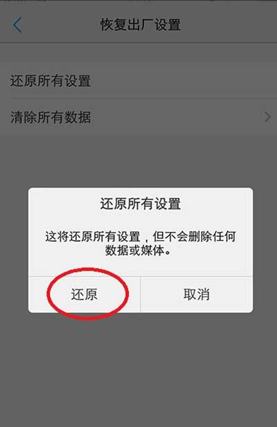 5、在出现还原所有设置对话框,点击【还原】,然后返回列表,选择【清理所有数据】,再点击【重置手机】