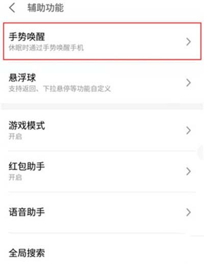 3、在辅助功能界面,找到【手势好唤醒】选项,点击打开。