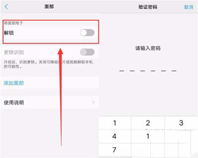 2、将面部用于【解锁】后面的开关开启,之后会让你验证手机上的解锁密码。