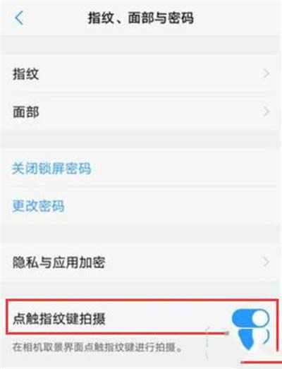 3、在指纹、面部与密码界面中,找到【点触指纹键拍摄】,打开该选项即可。