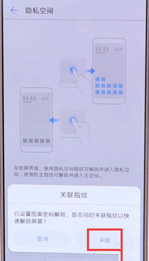 之后我们还可以点击【关联】,来关联指纹,使用不同于解锁主空间手指的指纹来解锁进入隐私空间。
