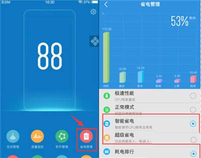点击【智能省电】会智能调节cpu频率及亮度来进行省电,点击【超级省电】只会保留手机的基本功能。