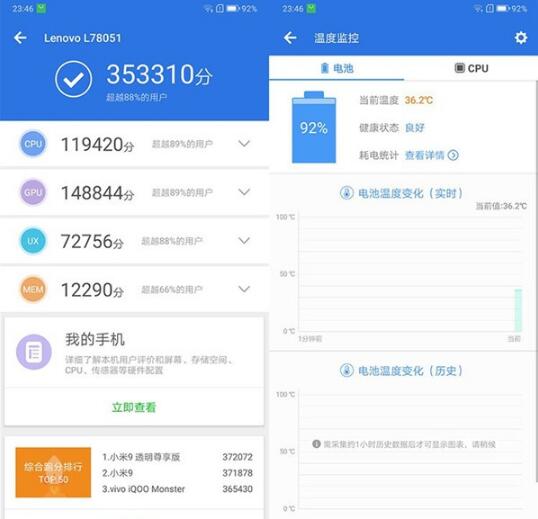 散热方面,联想Z6 Pro并没有发现过热的现象,运行MOBA类游戏中及游戏结束的过程中手机综合温度都保持的较低。