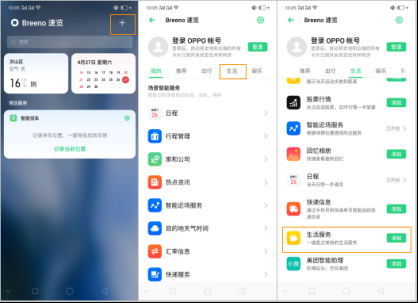2、然后点击【生活服务】旁边的“添加”进行相关开启,再通过桌面的负一屏就可以查看到相关功能了。
