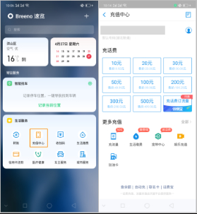 Reno的Breeno生活服务提供了转账、收钱码、充值中心、生活缴费、信用卡还款、医疗健康、车主服务、城市服务8个功能入口,点击就可以直接快速使用相应功能咯,不敢相信吧?