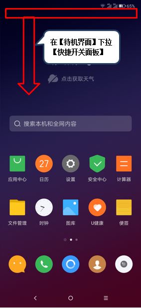 1、在【待机界面】下拉【快捷开关面板】。