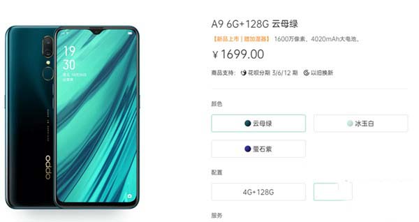 oppo a9搭载一块6.53英寸的水滴全面屏,屏占比达90.70%,机身采用了凝光渐变机身重现玉石般的通透润泽,拥有云母绿、萤石紫、冰玉白3种配色。