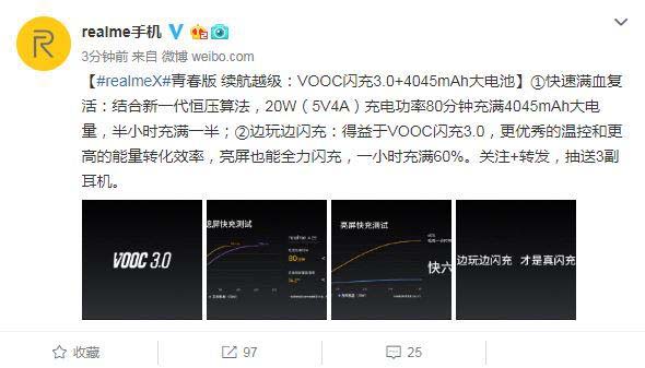 据realme产品总监王伟介绍,realme x所有系列产品都搭配了最新的VOOC 3.0闪充技术,标配5V4A功率高达20W的充电头。