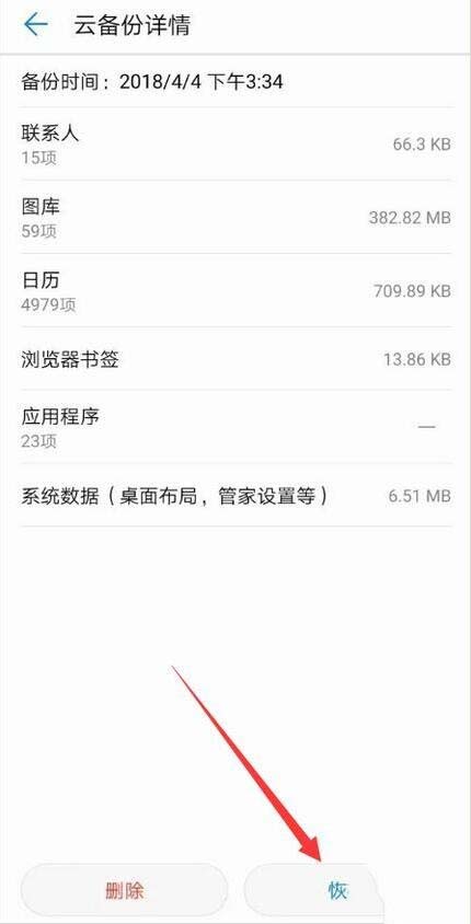 6.备份完成后,新的备份记录会出现在“备份记录”中,点击备份记录可以选择需要恢复到手机的数据,也可以将全部备份数据导入手机,这样就不怕删除数据了或换新手机了。