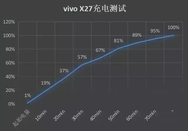 在充电实测中,10分钟可以充入19%的电量,30分钟充入57%,一小时充入89%,完全充满则需要1小时15分钟。