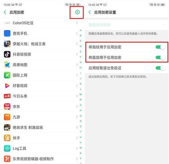 3、也可点击支持加密的应用右上角齿轮图标,选择打开或者关闭“将指纹用于应用加密”、“将面部用于应用加密”。配合基础密码加密,真正做到安全、智能、便捷。