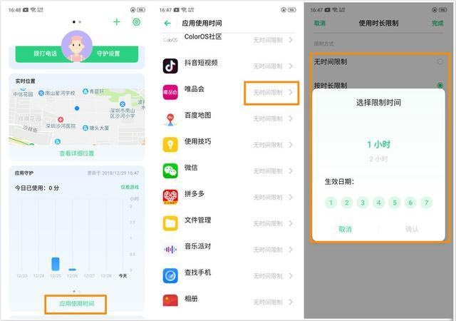 在【应用守护】中,我们除了可以查看到被守护人每天使用了什么软件,使用了多长时间,还可以为被守护人设置应用时长限制,设置流程如下图所示: