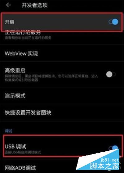 5、进入开发者选项界面之后,开启开发者选项,下滑找到【usb调试】,点击打开即可。
