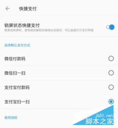 4、在快捷支付界面,打开【锁屏状态快捷支付】后面的开关,然后选择默认的支付方式即可。