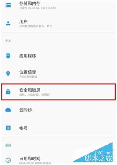 2、进去一加系统设置界面之后,点击【安全和锁屏】选项。