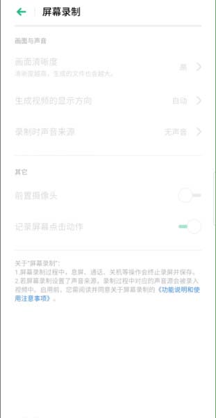 4、屏幕录制可以进行声音、画面相关设置。也可以设置是否旋转录制时的屏幕(非强制旋转);可以选择录制声音,也可以选择不录;可以选择记录屏幕点击动作,也可以设置为不记录;画面清晰度方面有高、中、低三种画质。