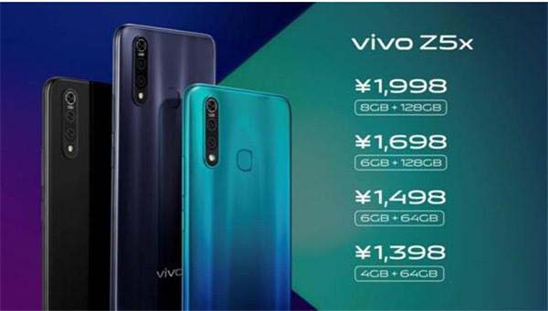 vivo Z5x手机4GB+64GB售价1398元、6GB+64GB售价1498元、6GB+128GB售价1698、8GB+128GB售价1998元。