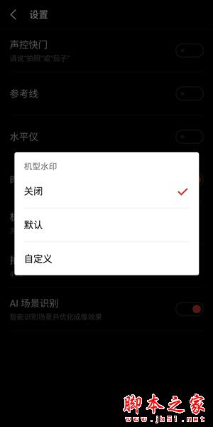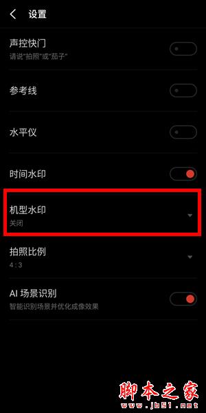 3.在设置菜单中找到机型水印选项,点击呼出选项设置菜单。