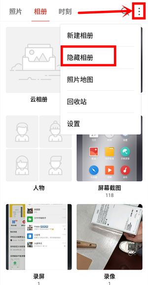 2.进入相册界面之后,找到并点击界面右上角的三个点图标,在弹出的相册设置导航中选择【隐藏相册】功能。
