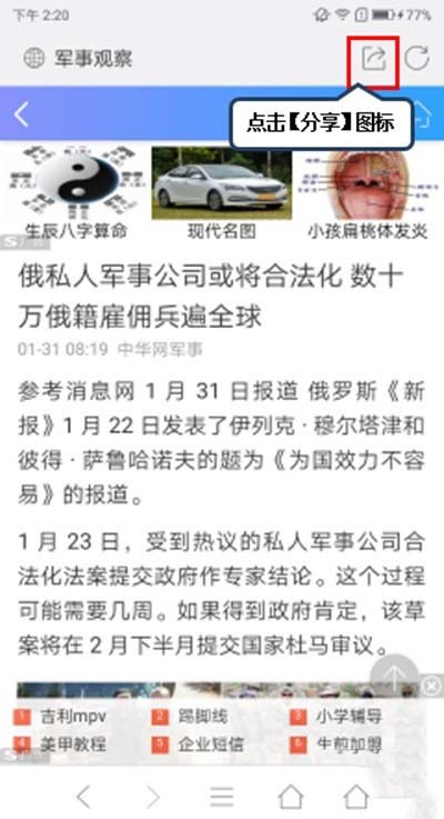 2、打开要分享的网页,点击右上角【分享】图标,如图所示。